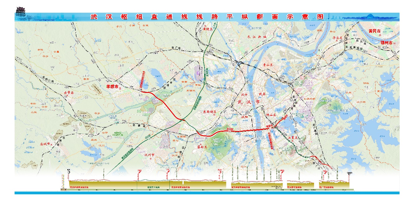 武漢樞紐直通線線路自漢孝城際毛陳站引出,出站后向南上跨府河、淪河,上跨滬蓉高速、漢宜線及漢江后折向東,線路過長江引入武廣高鐵烏龍泉東站,正線全長80.1km,同時新建黃家湖至南湖東聯絡線溝通武九客專,線路長7.6km。
