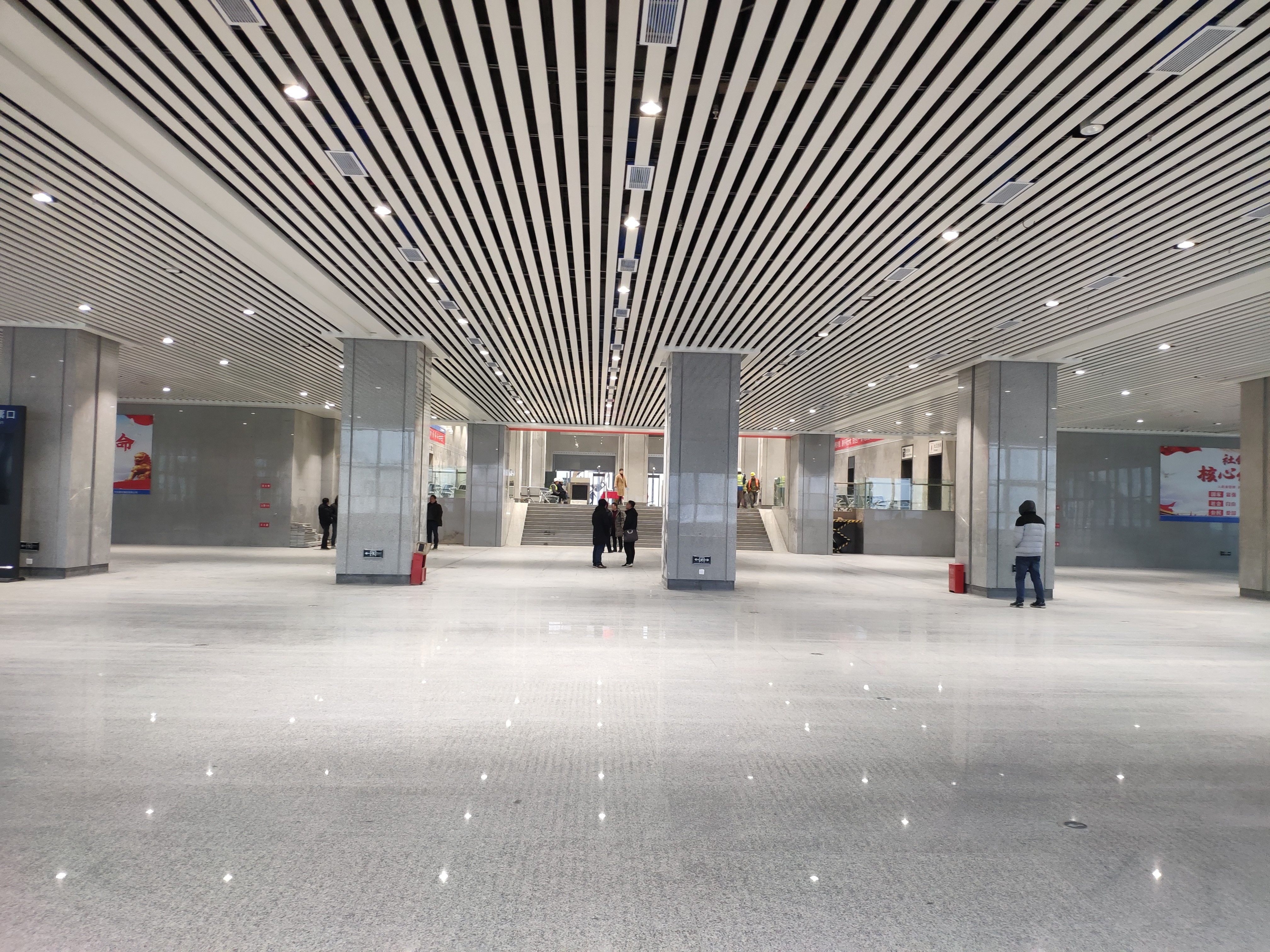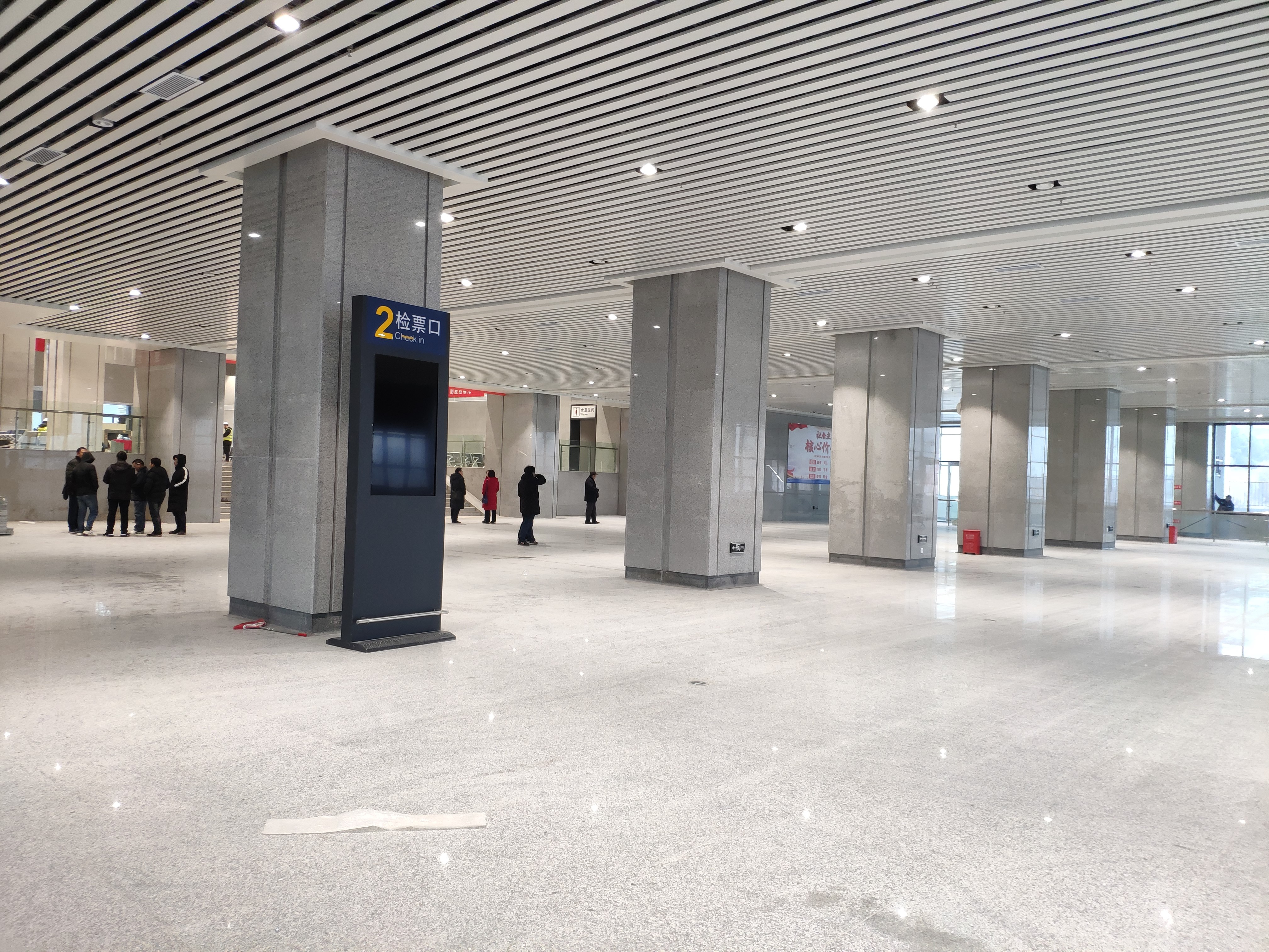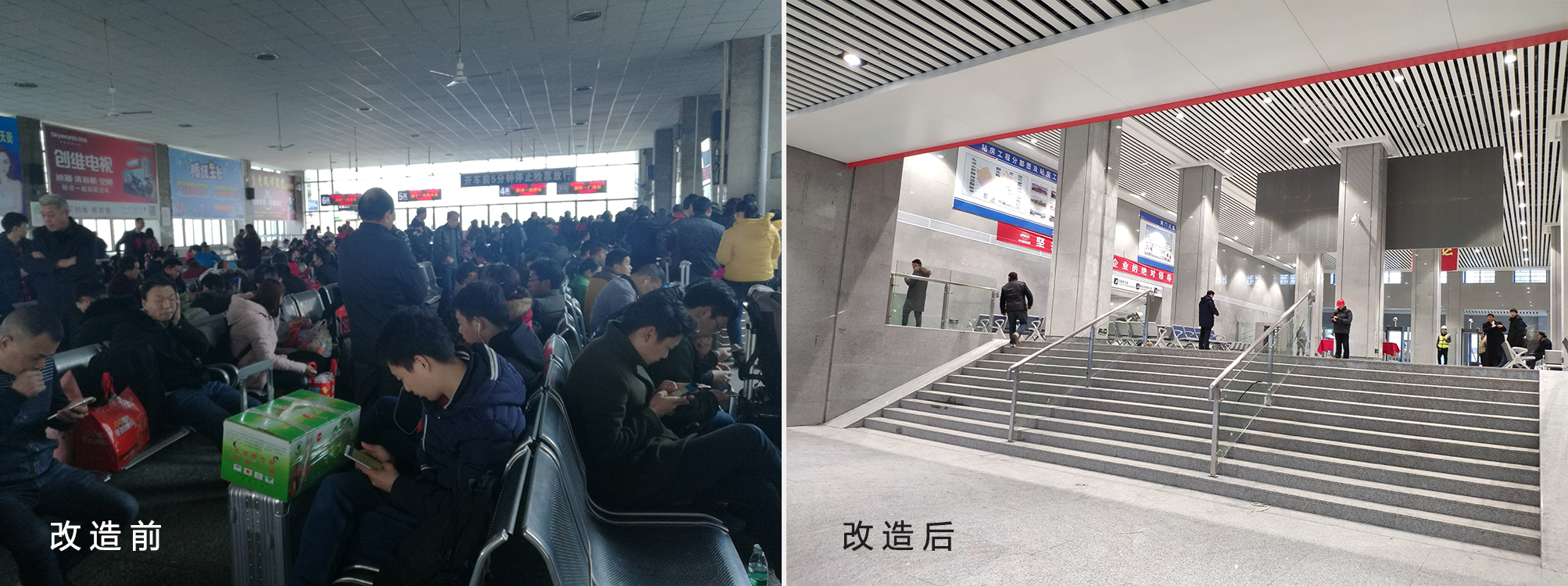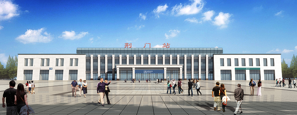 擴建站房為—層框架結構建筑。完善驗證區域、安檢區域流線及功能;對候車廳內 常旅客候車、重點旅客候車及軟席候車室重新進行功能劃分;設置出站廳及相關輔助配套房屋以方便旅客出站。擴建后候車廳面積為 3 9 4 5. 6 2 平方米, 擴建后站房總建筑面積為8871.36平方米, 改造后, 整棟建筑造型簡潔大氣,以堅實而穩重的構圖關系體現了荊門站濃郁的荊楚文化特征。