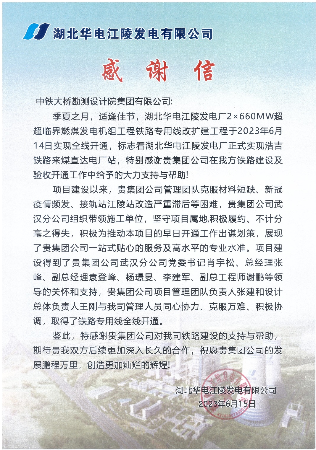 6月20日,收到湖北華電江陵發電有限公司發來的感謝信。對中鐵大橋院集團在湖北華電江陵發電廠2×660MW超臨界燃煤發電機組工程鐵路專用線改擴建工程鐵路建設及驗收開通工作中付出的努力給予表揚和肯定。項目建設以來,項目管理團隊克服材料短缺、新冠疫情頻發、接軌站江陵站改造嚴重滯后等困難,武漢分公司組織帶領施工單位,堅守項目屬地,積極履約、不計分毫之得失,積極為推動本項目的早日開通工作出謀劃策,展現了一站式貼心的服務及高水平的專業水準。項目建設得到了武漢分公司黨委書記肖宇松、總經理張峰、副總經理袁登峰、楊璟旻、李建軍、副總工程師謝鵬等領導的關懷和支持,項目管理團隊負責人張建和設計總體負責人王剛與湖北華電江陵發電有限公司管理人員同心協力、克服萬難、積極協調,取得了鐵路專用線全線開通。