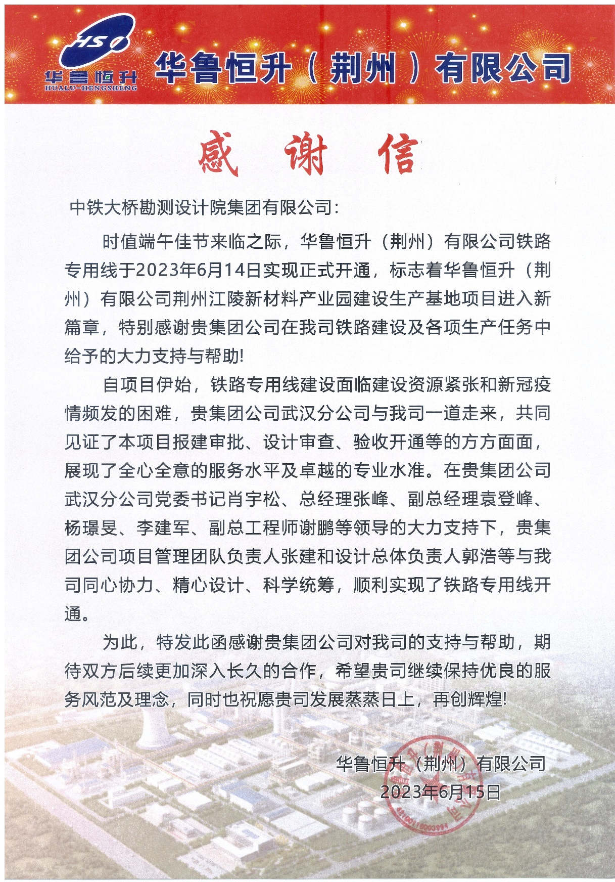 6月20日,收到華魯恒升(荊州)有限公司發來的感謝信,特別感謝在鐵路建設及各項生產任務中給予的大力支持與幫助。自項目伊始,鐵路專用線建設面臨建設資源緊張和新冠疫情頻發的困難,共同見證了該項目報建審批、設計審查、驗收開通等的方方面面,展現了全心全意的服務水平及卓越的專業水準。在武漢分公司黨委書記肖宇松、總經理張峰、副總經理袁登峰、楊璟旻、李建軍、副總工程師謝鵬等領導的大力支持下,公司項目管理團隊負責人張建和設計總體負責人郭浩等與華魯恒升(荊州)有限公司同心協力、精心設計、科學統籌,順利實現了鐵路專用線開通。